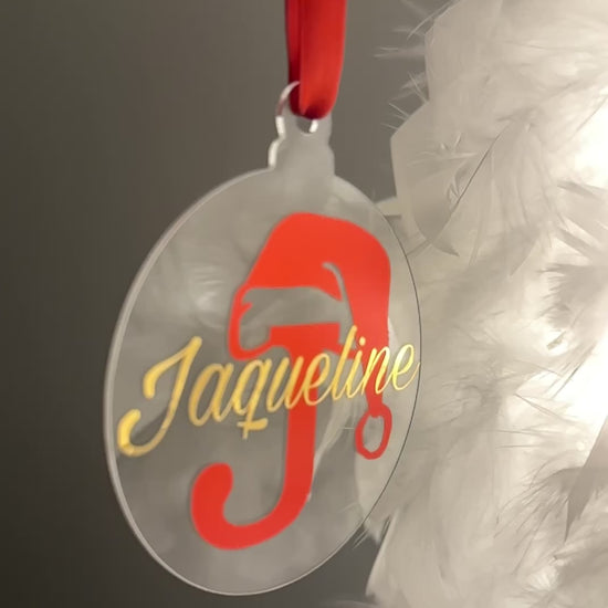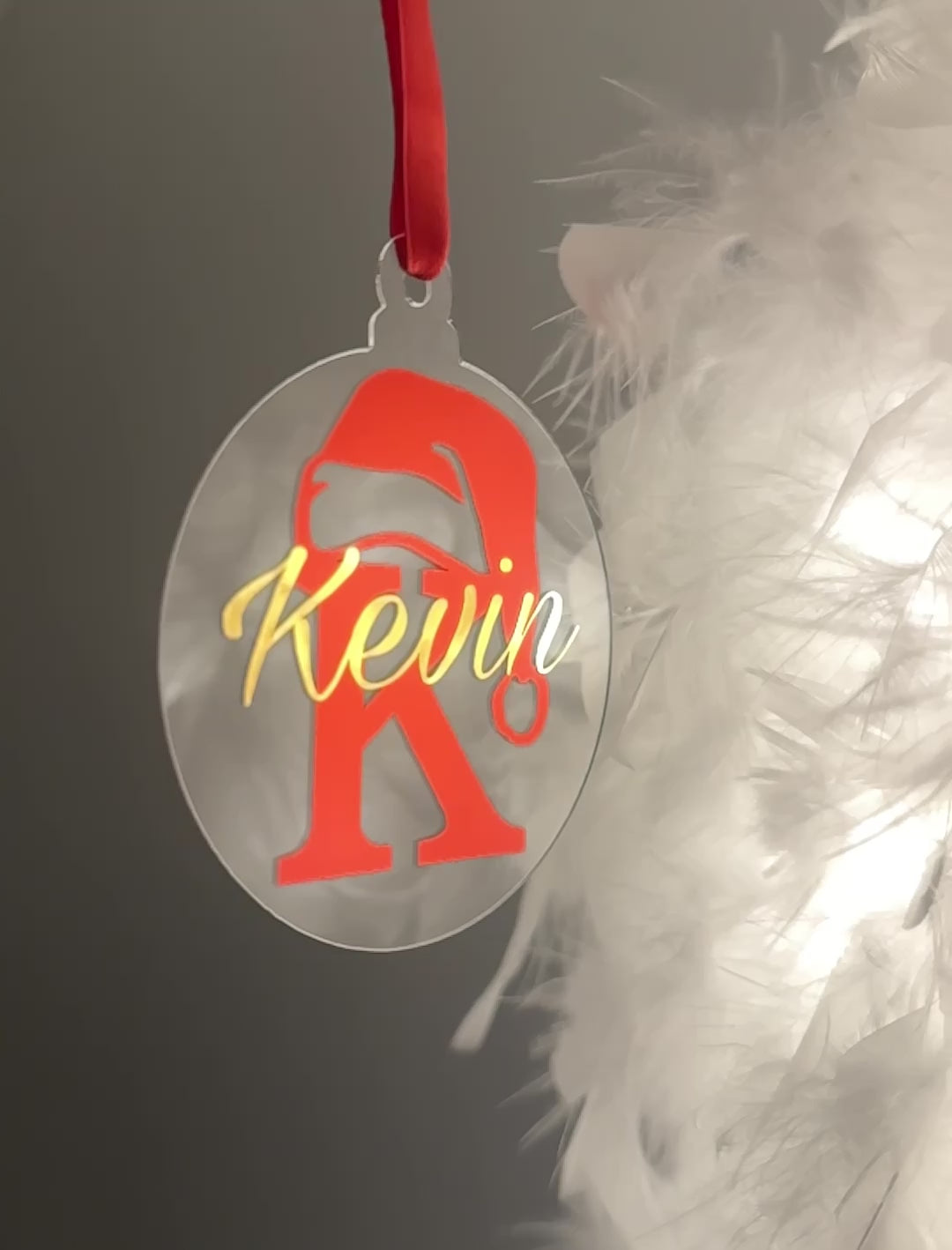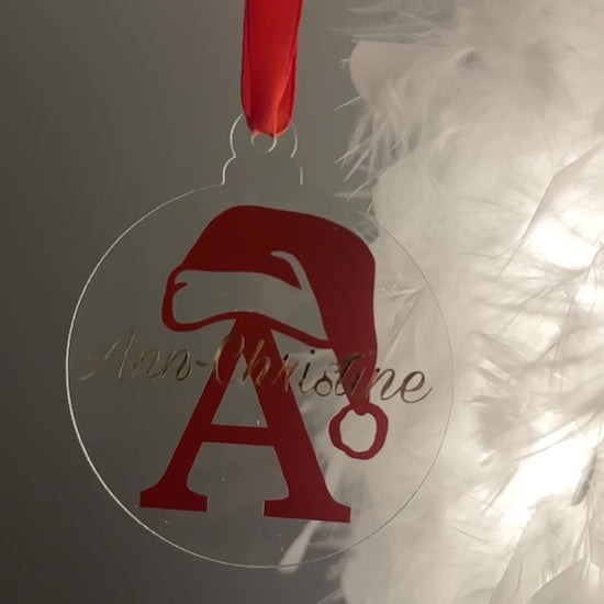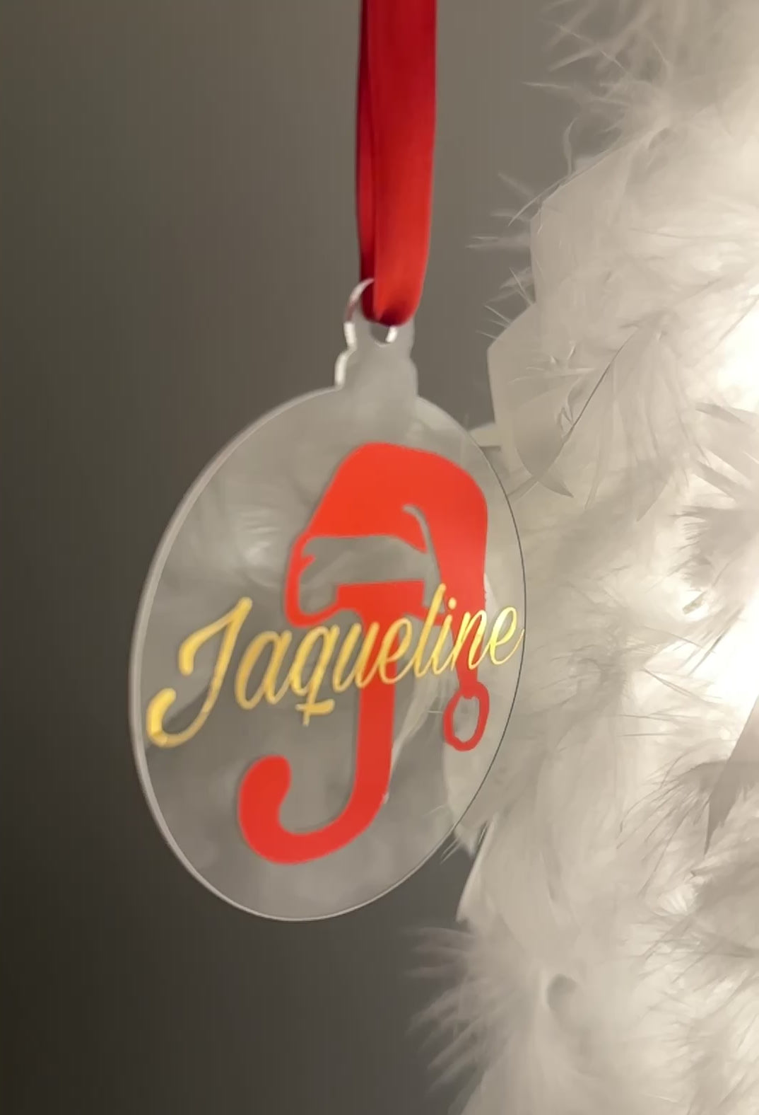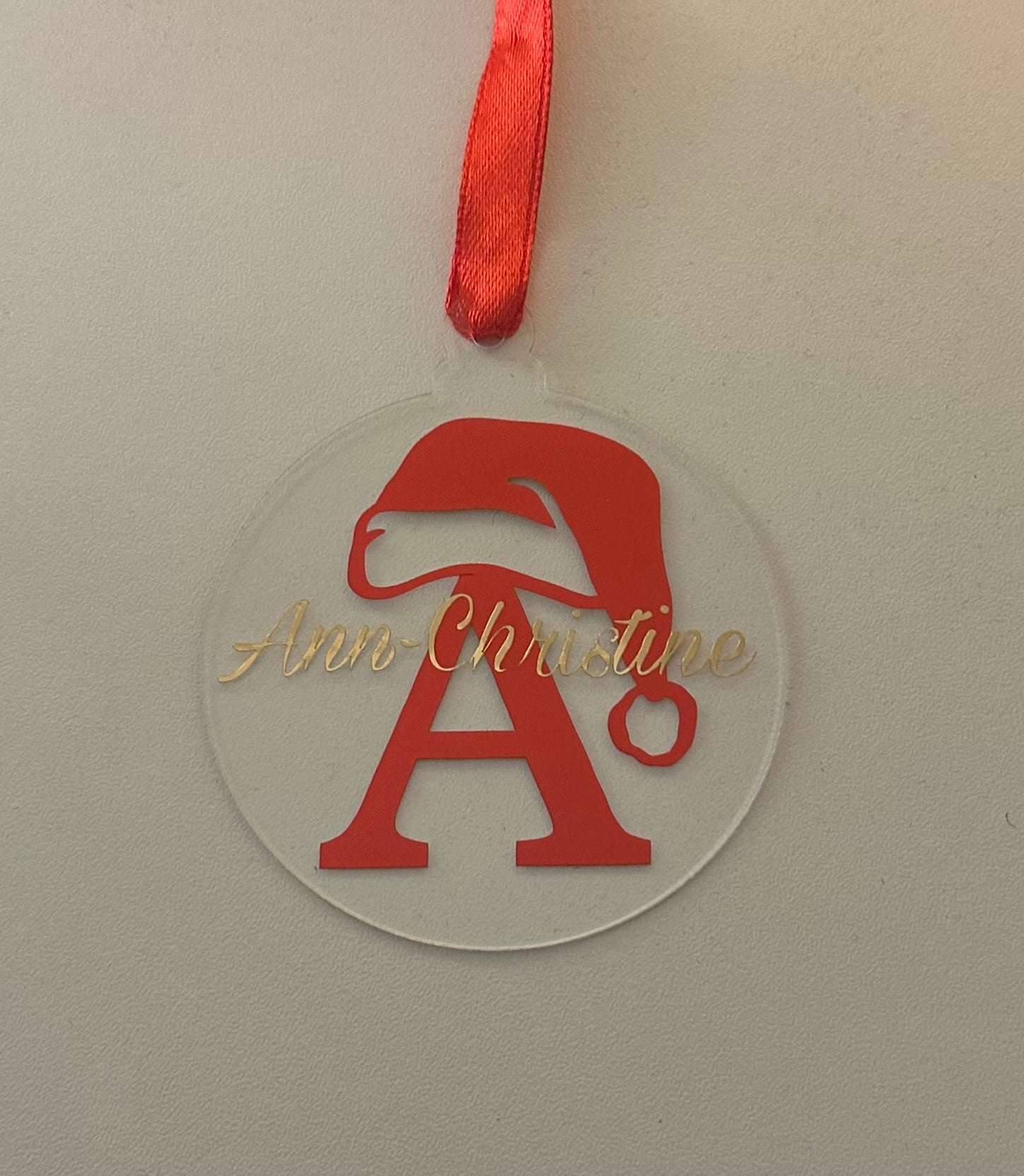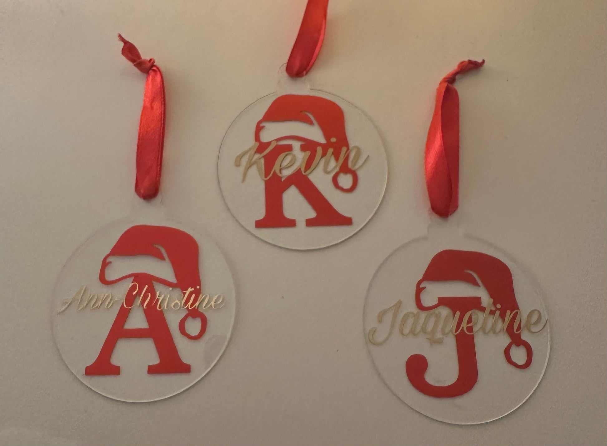 Die Ornamente bestehen aus transparentem Acryl und werden mit hochwertiger Vinylfolie veredelt. Jedes Ornament zeigt eine große Initiale mit Weihnachtsmütze sowie den dazu passenden Namen in elegantem Schriftzug. Abgerundet wird das Design mit einem festlichen Satinband zum Aufhängen.