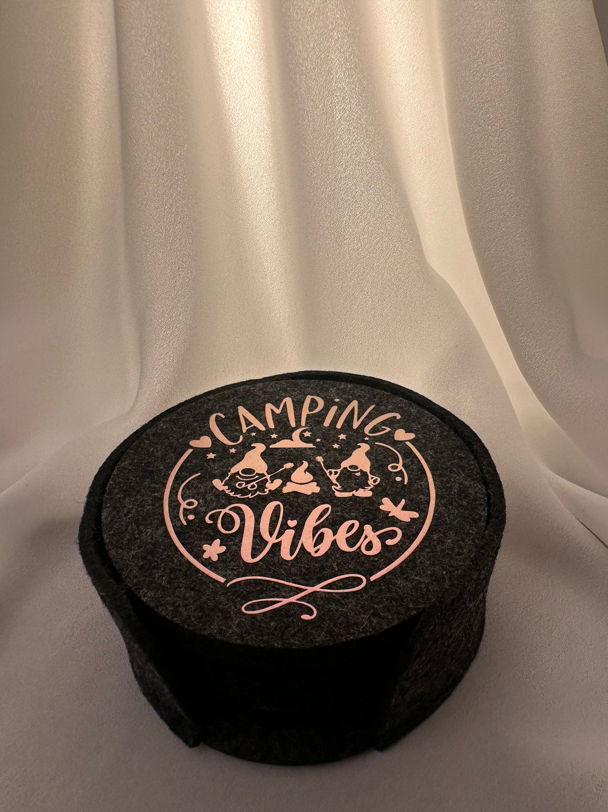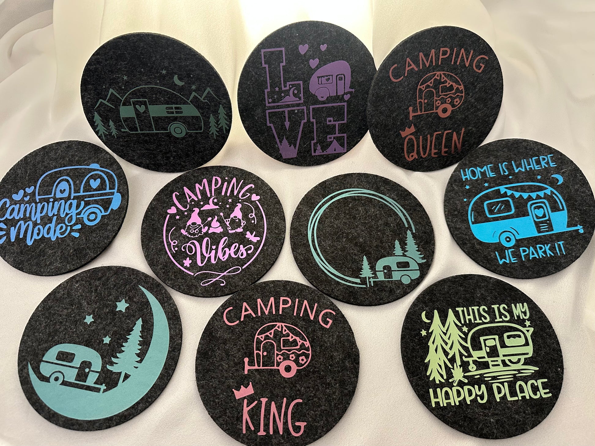 Dieses Set besteht aus 10 runden Filzuntersetzern mit Vinylfolien-Designs in verschiedenen Farben und Motiven – inklusive praktischem Aufbewahrer. Ideal für alle, die Camping, Vanlife und das Reisen im Wohnwagen lieben.