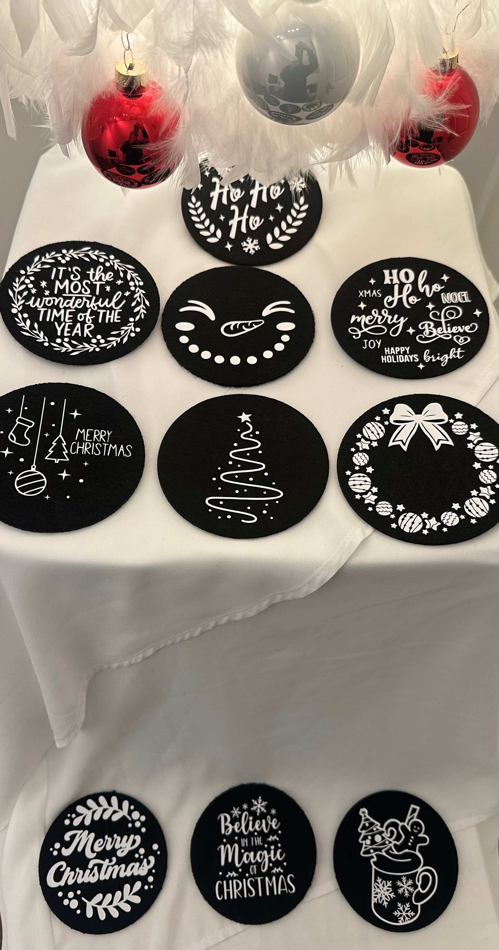 Die Untersetzer bestehen aus hochwertigem Filz und sind mit Vinylfolie versehen, die für klare, langlebige Motive sorgt. Sie schützen zuverlässig vor Flecken, Hitze und Kratzern und bringen gleichzeitig festliche Eleganz auf deinen Tisch.